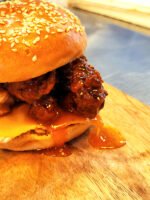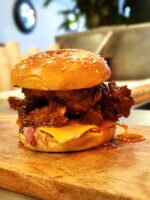 Indulge in buttermilk fried chicken topped with chapotle mayo, crispy onions, candi bacon and gooey cheese served on a toasted bun, this burger will make your taste buds sing!